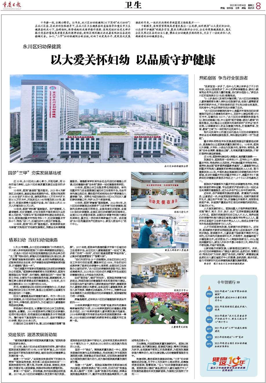 这10年,是永川妇幼全面加强党的领导,提升谋划医院改革发展能力的10年;10年“赶考”路上,永川妇幼始终坚定不移地加强党的建设,踏实走好妇幼健康事业发展的每一步。