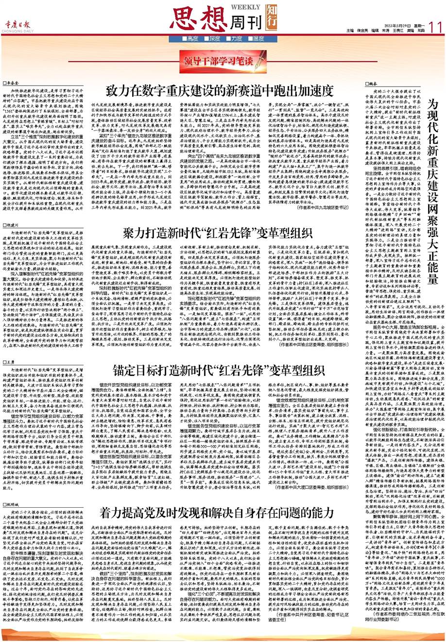 深入理解新时代“红岩先锋”变革型组织的重大意义。结合重庆党建特色和优势,与时俱进打造新时代“红岩先锋”变革型组织,具有重大现实意义和深远历史意义。一是传承伟大建党精神的鲜活体现。打造新时代“红岩先锋”变革型组织,就是弘扬伟大建党精神、赓续红色血脉,从伟大建党精神中汲取信仰的力量、真理的力量、奋斗的力量,以实际行动坚决拥护“两个确立”、坚决做到“两个维护”,为强国建设、民族复兴注入强劲精神动力和力量源泉。二是推进新的伟大工程的有效载体。打造新时代“红岩先锋”变革型组织,就是把党建统领摆在突出位置,贯穿于新时代党的建设全过程各方面,发扬彻底的自我革命精神,全面提升党的领导力和问题管控力,在深入推进新时代党的建设新的伟大工程中展现重庆新气象、实现重庆新作为。三是建设现代化新重庆的重大举措。打造新时代“红岩先锋”变革型组织,就是顺应现代化新重庆建设新成效、新贡献、新地位、新感受、新气象的任务要求,推进组织体系重构、流程再造、能力重塑,善于塑造变革、敢于唯实争先,以党员干部敢为带动地方敢闯、企业敢干、群众敢首创,不断推动现代化新重庆建设迈出新步伐、取得新成效。
