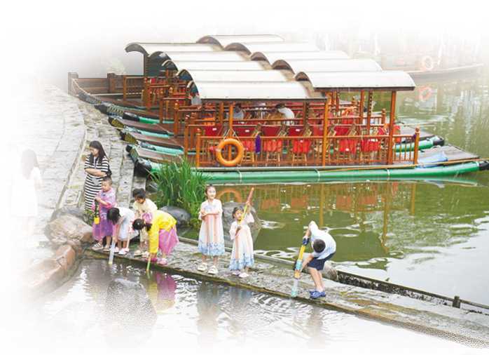 走在黄龙溪古镇,随处可见玩水的人们。在龙潭广场、镇龙街、龙尾戏水区,游客们正在欢快戏水。