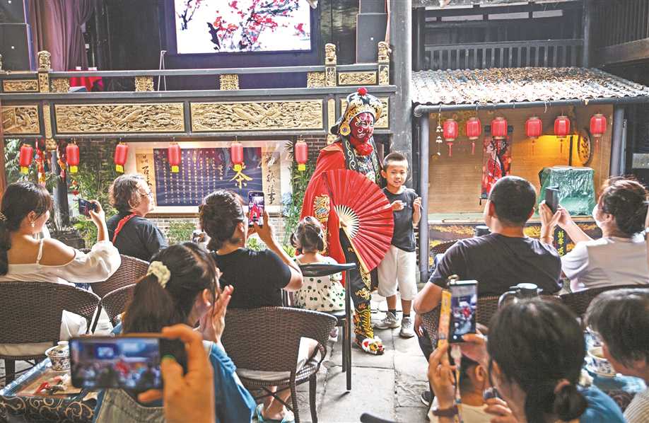 走进宝善宫院内,记者看到,院落由一层层台地组成,建筑随着地势逐步“长高”。第一层台地上,可以品盖碗茶,看川剧“变脸”表演;第二层台地上,是磁器口古镇书法创作基地;第三层台地上,还有一座百家姓文化馆。驻足片刻,便能听到天南地北的方言和欢笑声一起,回荡在这座上百年历史的院落中。