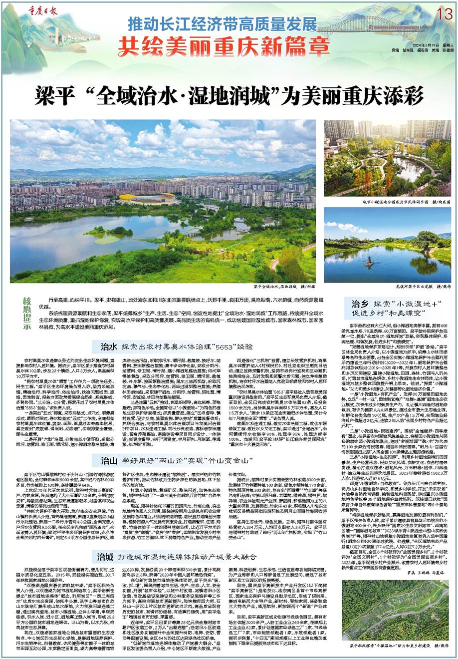 系统梳理资源禀赋和生态家底,梁平统筹城乡“生产、生活、生态”空间,创造性地提出“全域治水·湿地润城”工作思路,持续提升全域水生态环境质量,重抓湿地保护修复,实现高水平保护和高质量发展、高品质生活的有机统一,成功创建国际湿地城市、国家森林城市、国家园林县城,为高水平建设美丽重庆添彩。
