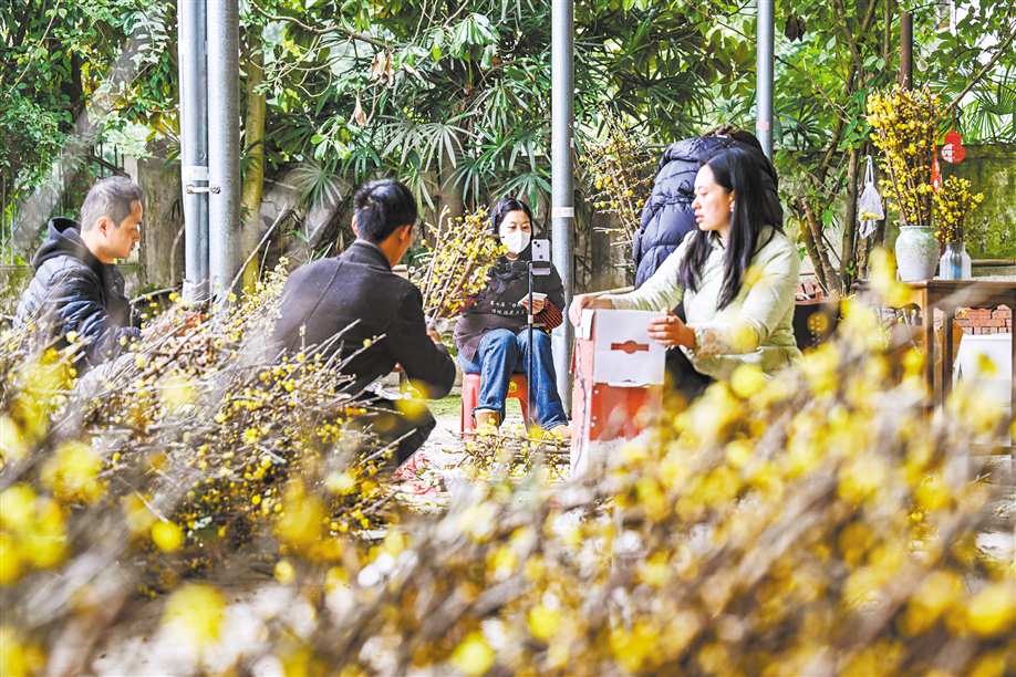 12月14日,北碚区静观镇素心村,工作人员一边忙着将香气浓郁的蜡梅花打包发货,一边在现场展开直播向网友介绍当地蜡梅花的特色。