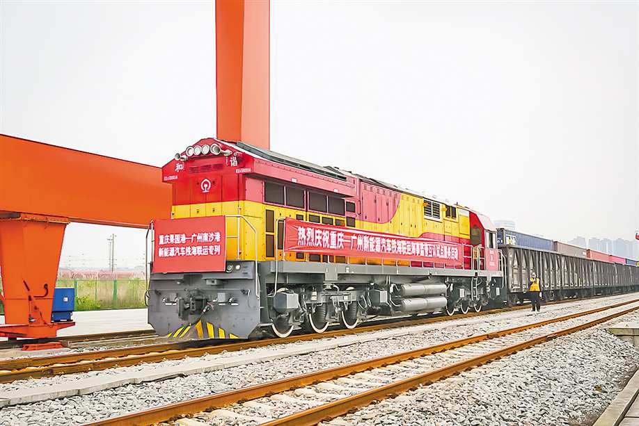 本报讯 (新重庆-重庆日报记者 杨铌紫)1月7日,一列满载有108台“重庆造”新能源汽车的铁海联运专列,从果园港鱼嘴站发出(右图),预计48小时后抵达广州南沙港,随后换装海轮运往中东市场。