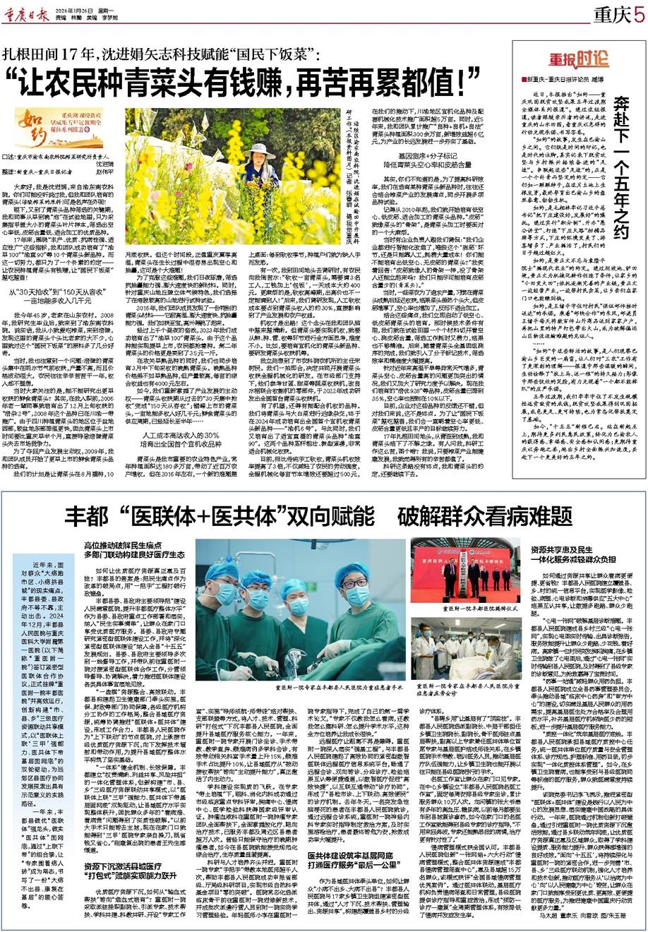 “一体系”健全机制、长效保障。丰都建立“权责清晰、利益共享、风险共担”的一体化管理体系,创新构建“市、县、乡”三级医疗资源联动共享模式,以“医联体上联“三甲”强能力、医共体下带基层固网底”双轮驱动,让县域医疗水平实现整体跃升,困扰群众多年的“看病难、看病贵”问题得到了实质性破解。“以前大手术只能转去主城,现在在家门口就能得到‘三甲’医院专家亲自操刀,既省钱又省心。”刚康复出院的患者王先生感慨道。