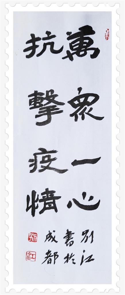 万众一心 抗击疫情(隶书)。 作者 别江